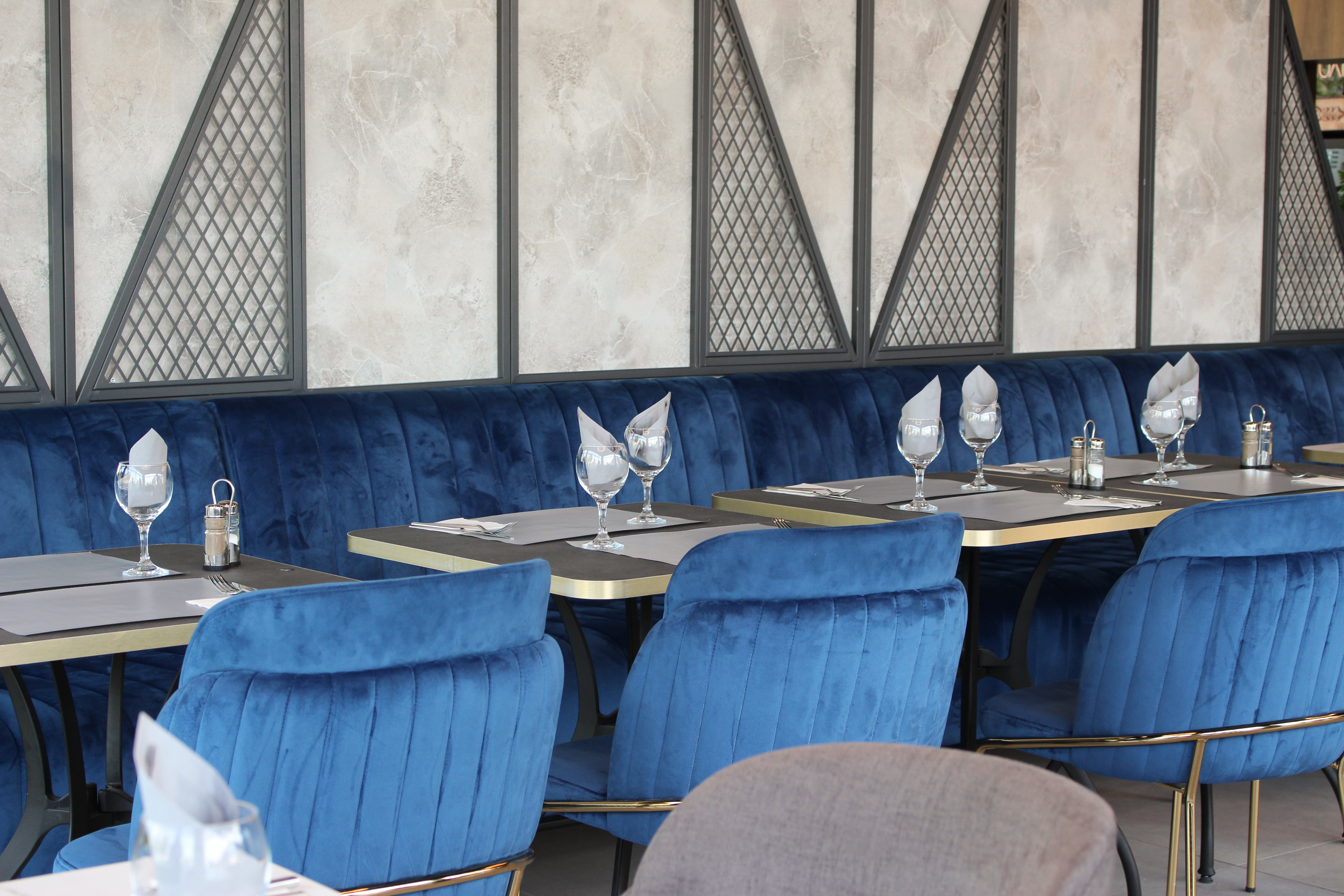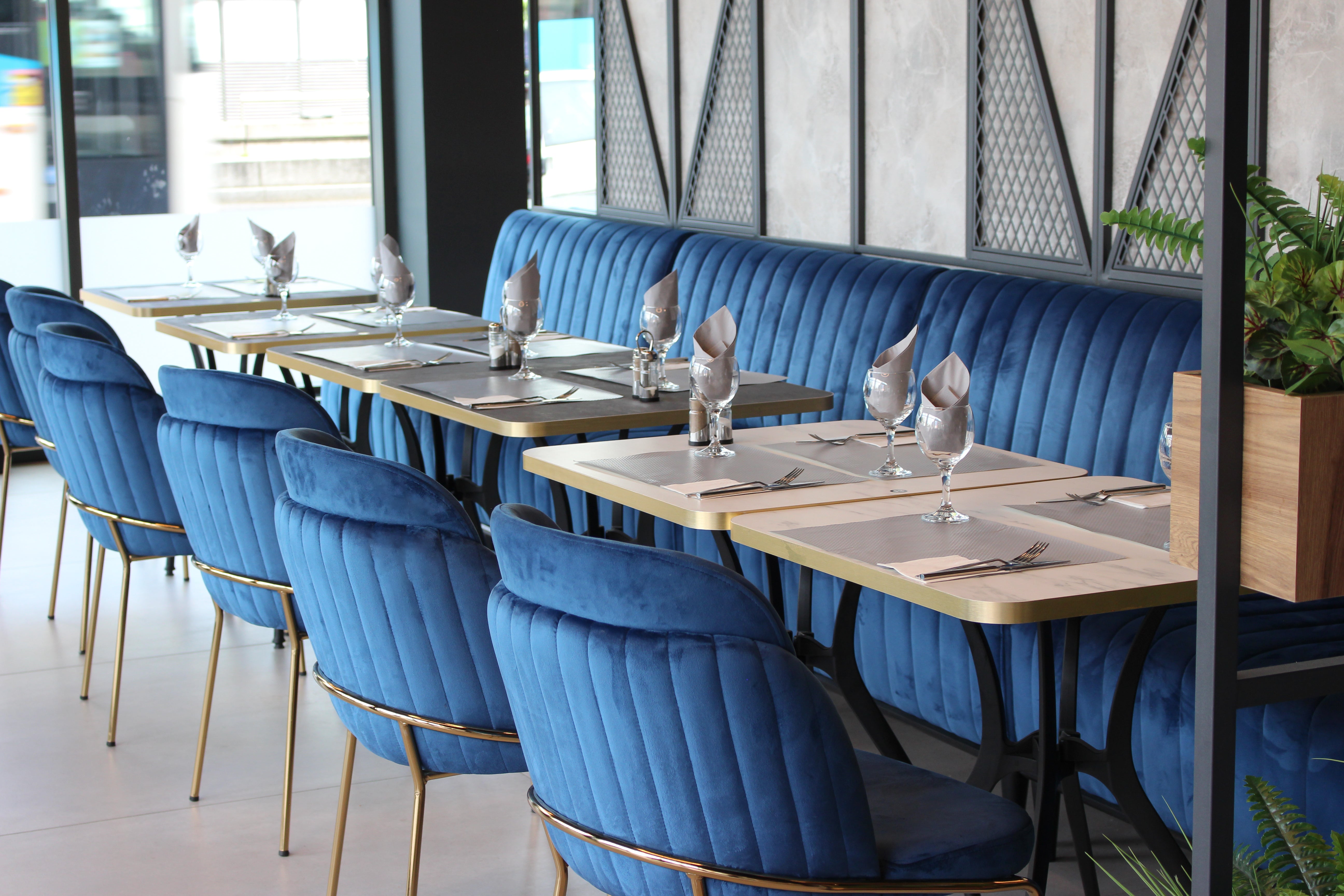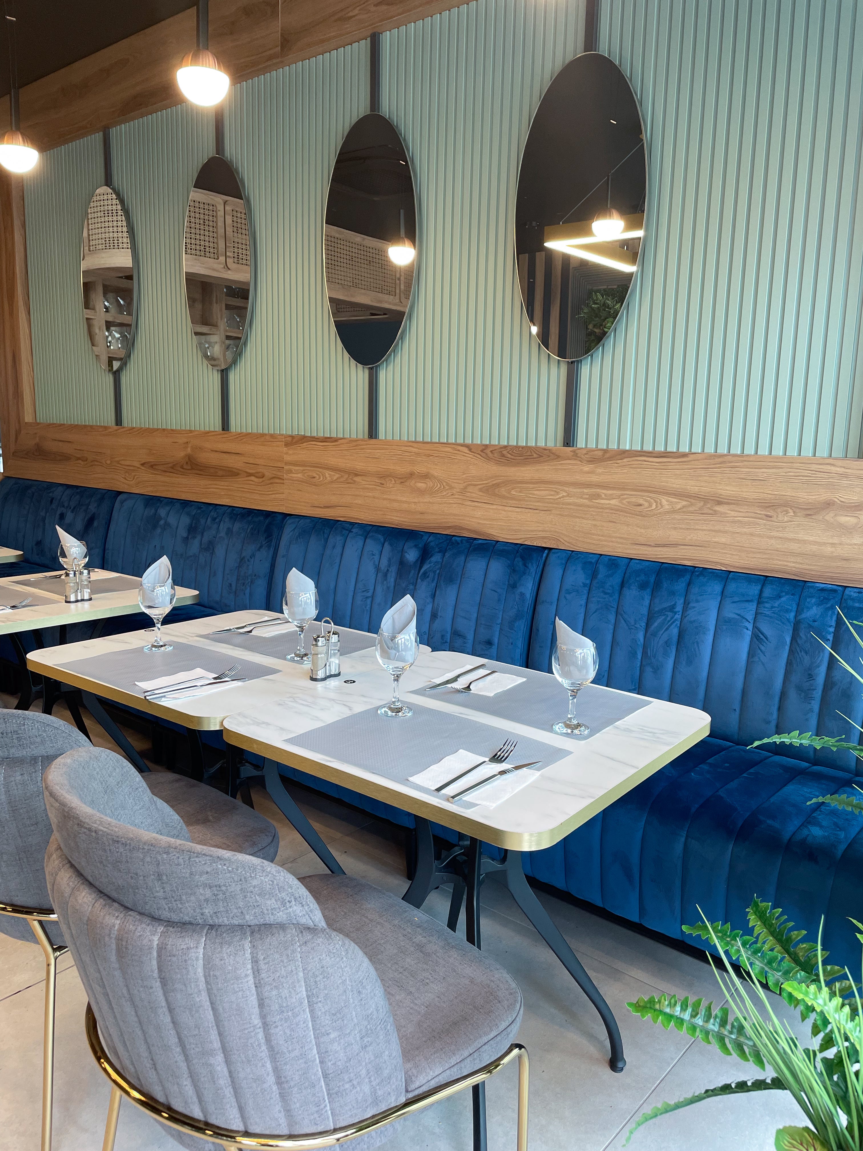 Mobilier : Plateau de table marbré chant gold, pied M900, banquette CHARLY, chaise DINA