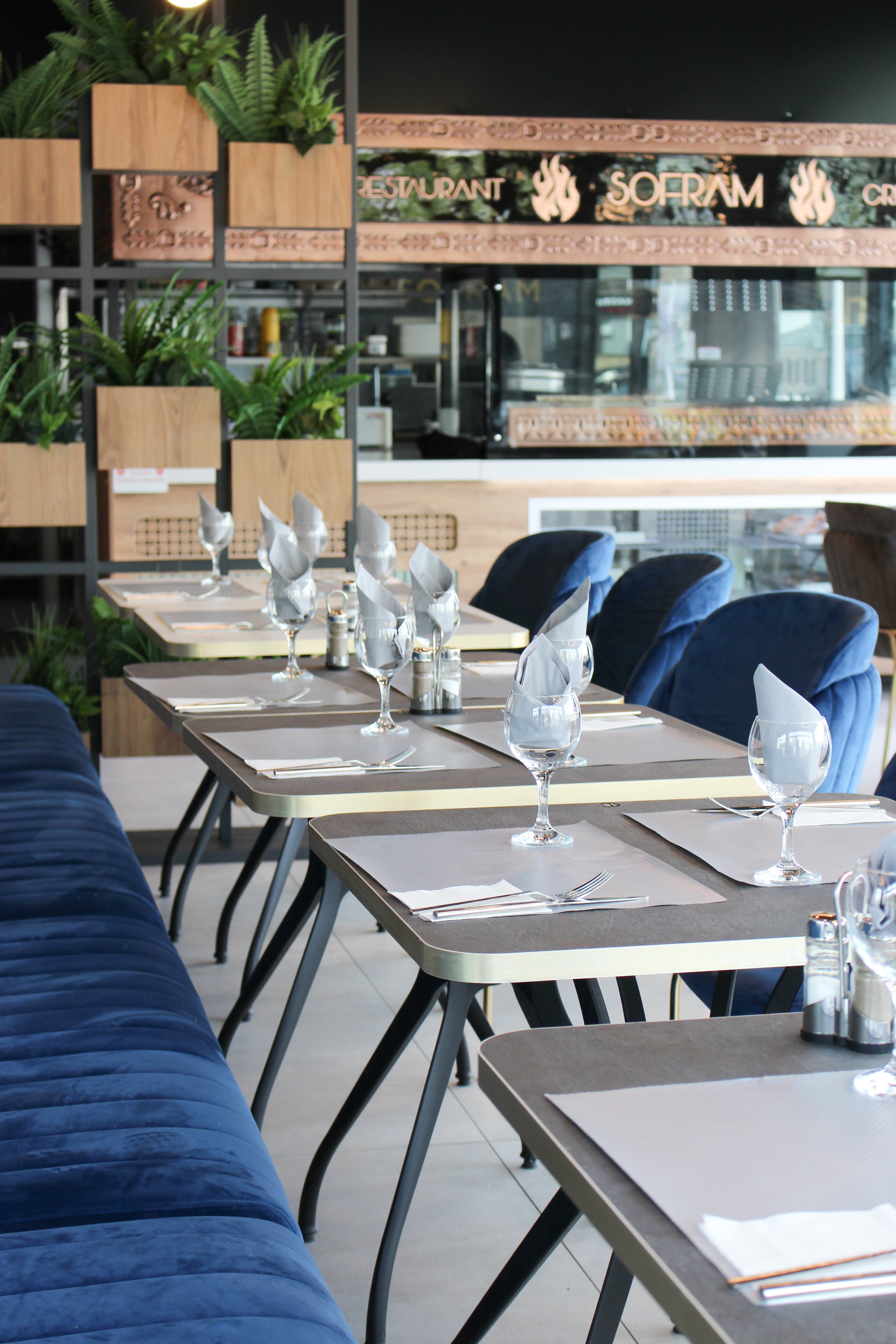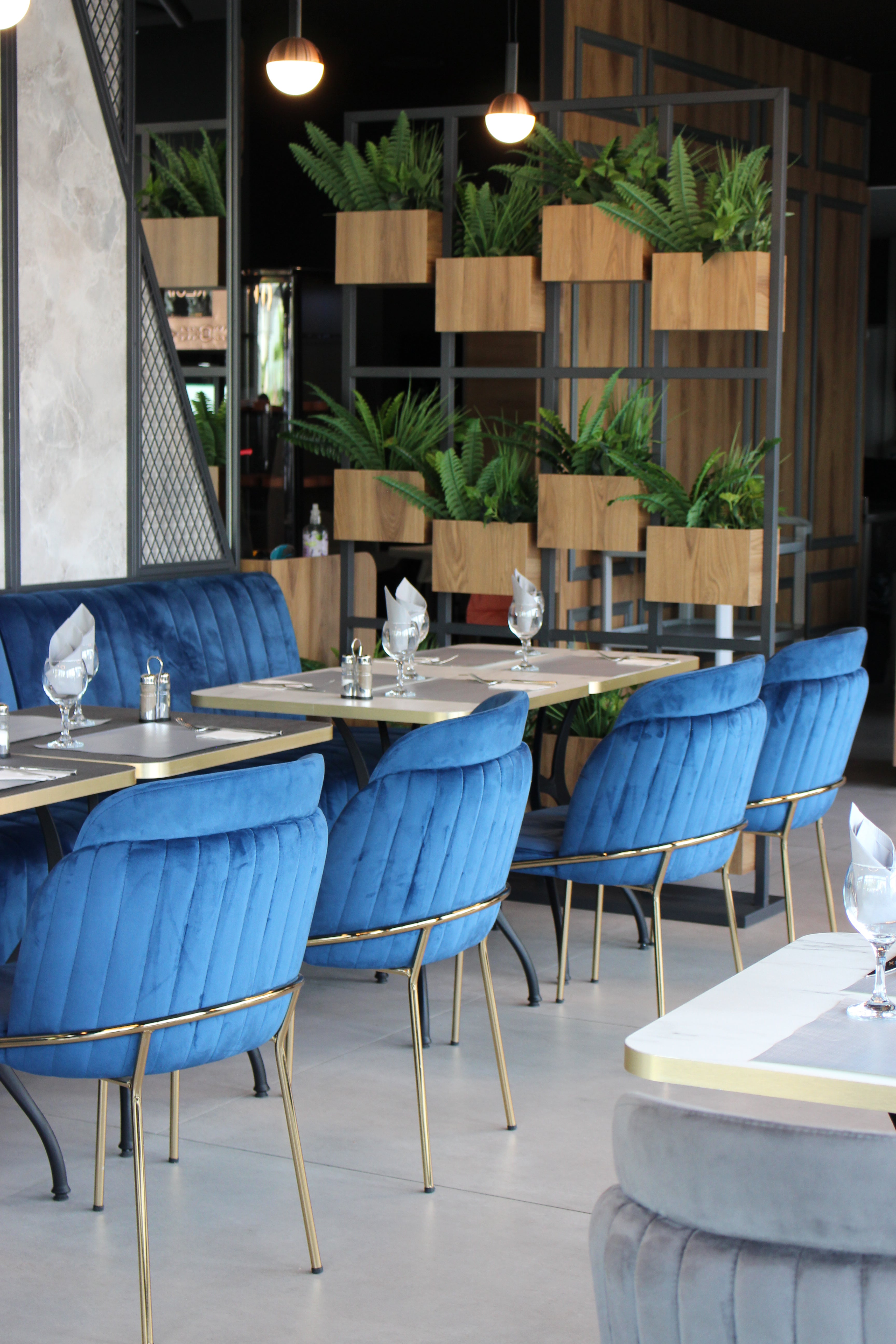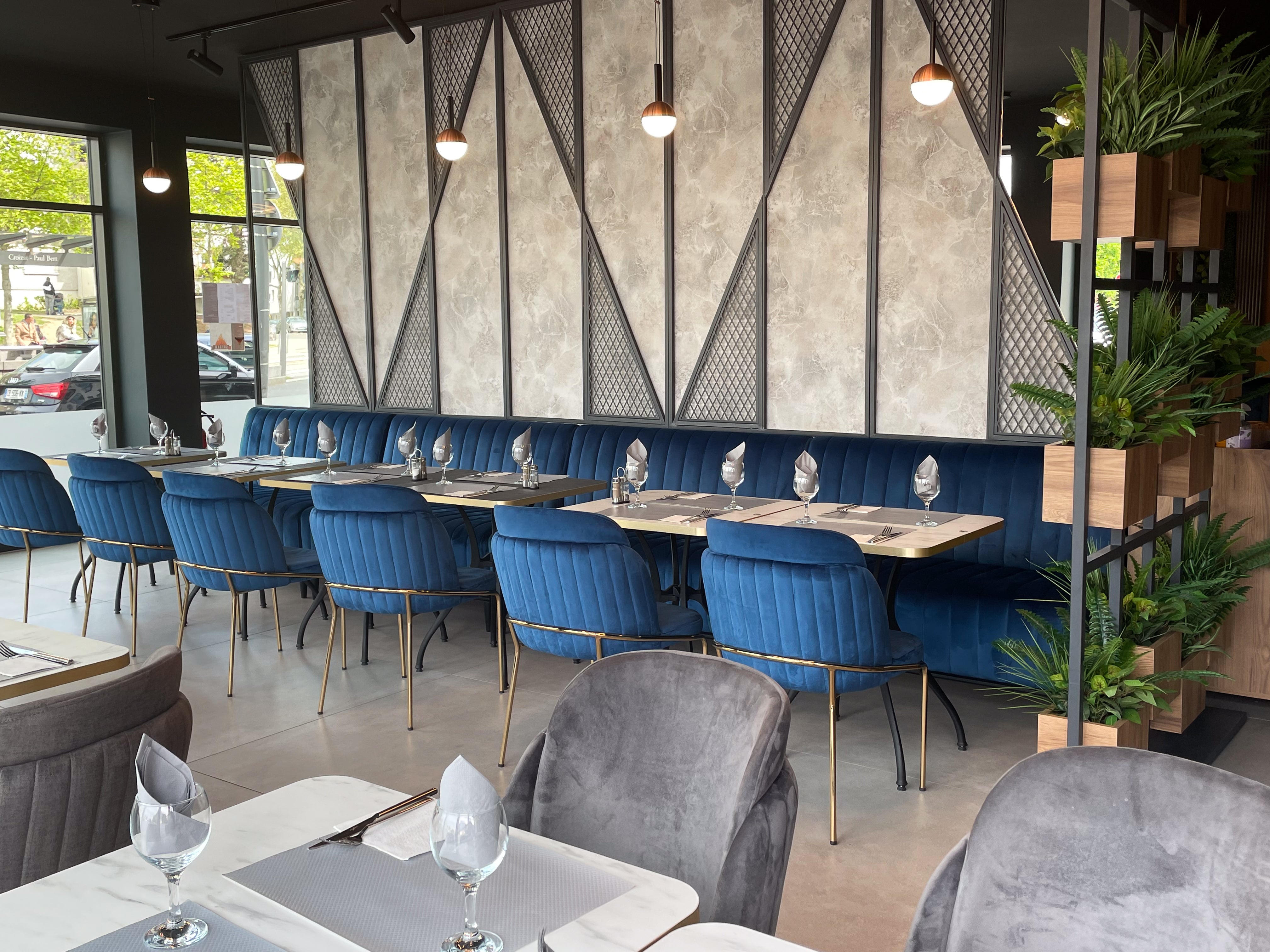 Mobilier : Plateau de table marbré chant gold, pied M900, banquette CHARLY, chaise DINA